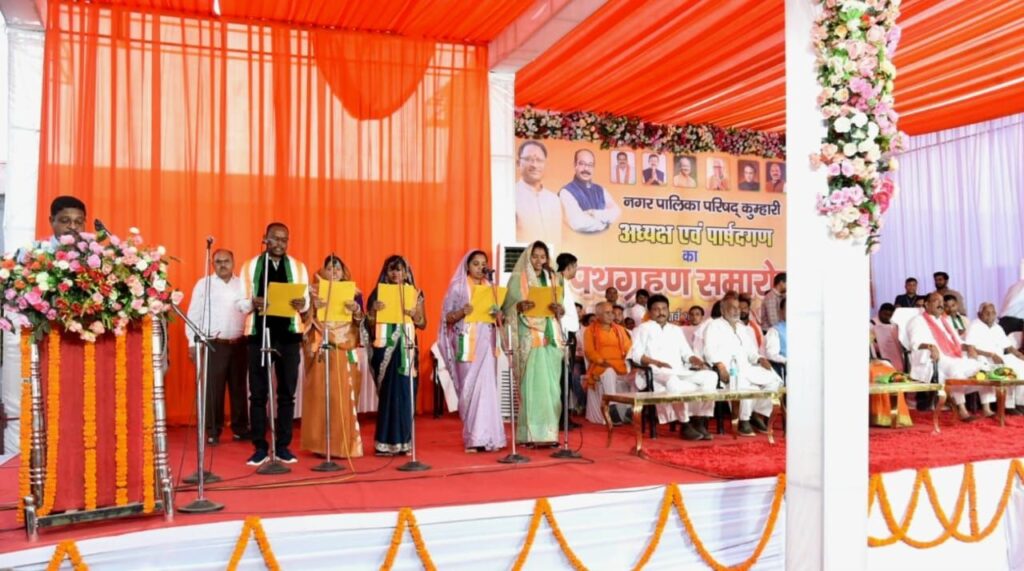 बिलासपुर. 5 मार्च 2025. उप मुख्यमंत्री तथा नगरीय प्रशासन एवं विकास मंत्री श्री अरुण साव के मुख्य आतिथ्य में आज कुम्हारी नगर पालिका के नवनिर्वाचित अध्यक्ष एवं पार्षदों का शपथ ग्रहण संपन्न हुआ। विधायक श्री डोमनलाल कोर्सेवाड़ा भी शपथ ग्रहण समारोह में शामिल हुए। कुम्हारी के बाजार चौक स्थित शासकीय प्राथमिक शाला में आयोजित समारोह में एसडीएम श्री महेश राजपूत ने नवनिर्वाचित अध्यक्ष श्रीमती मीना वर्मा और पार्षदों को शपथ दिलाई।