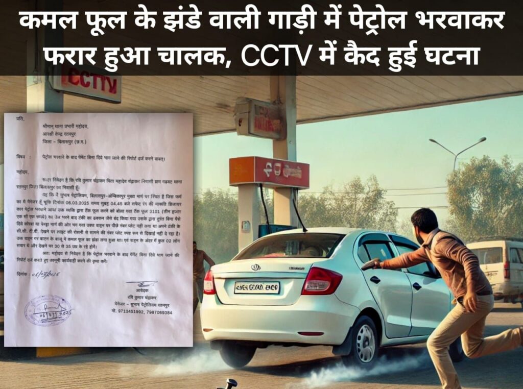 बिलासपुर (छ.ग.) – जिले की धार्मिक नगरी रतनपुर स्थित एक पेट्रोल पंप पर एक बड़ा फर्जीवाड़ा सामने आया है। कमल फूल के झंडे लगी एक सफेद मारुति डिजायर कार में पेट्रोल भरवाने के बाद चालक बिना भुगतान किए फरार हो गया। पूरी घटना CCTV कैमरे में कैद हो गई है।