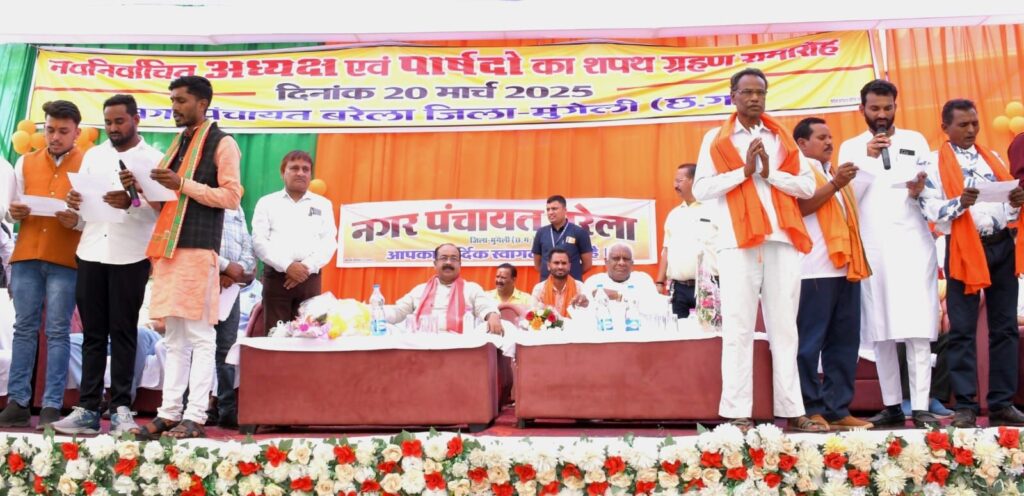 बिलासपुर. 20 मार्च 2025. उप मुख्यमंत्री श्री अरुण साव आज मुंगेली जिले के बरेला और जरहागांव नगर पंचायत में नवनिर्वाचित अध्यक्षों और पार्षदों के शपथ ग्रहण समारोह में शामिल हुए। विधायक श्री पुन्नूलाल मोहले भी शपथ ग्रहण कार्यक्रम में शामिल हुए। मुंगेली की एसडीएम श्रीमती पार्वती पटेल ने बरेला और जरहागांव में आयोजित दो अलग-अलग समारोहों में बरेला नगर पंचायत के नवनिर्वाचित अध्यक्ष श्री नरेश पटेल और जरहागांव नगर पंचायत की अध्यक्ष श्रीमती रूपाली वेदप्रकाश कश्यप तथा दोनों नगर पंचायतों के पार्षदों को विधिपूर्वक शपथ दिलाई।
