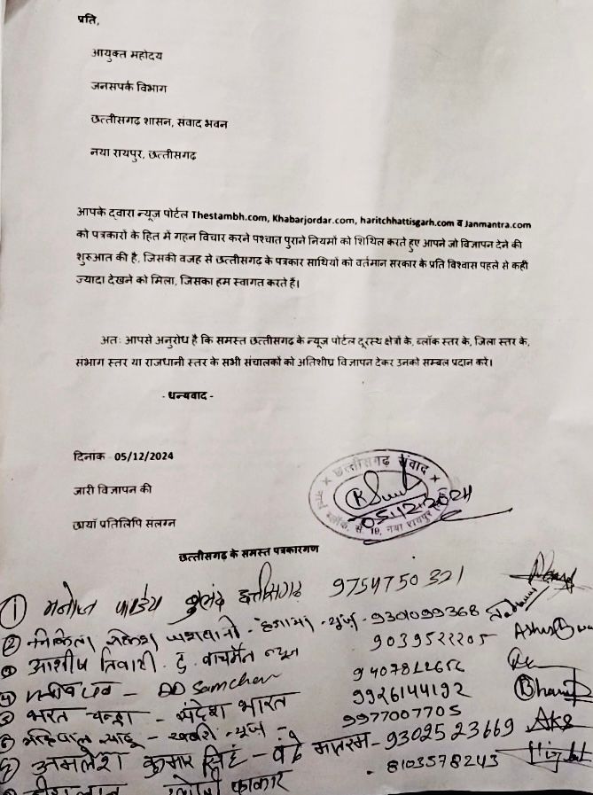 आगे कहा आप अपना न्यूज़ पोर्टल का डिटेल जैसे पोर्टल का नाम, कहाँ से संचालित हो रहा है, कब से की शुरुआत हुई, संचालक का नाम व रजिस्ट्रेशन सभी जानकारी वॉट्सएप मोबाईल नम्बर 09424262547 पर सेंड करें ताकि संवाद में छत्तीसगढ़ के समस्त ज़िलों से न्यूज़ पोर्टलों की जानकारी एक साथ लेकर आयुक्त, जनसंपर्क विभाग, छत्तीसगढ़ शासन, संवाद भवन, नया रायपुर को अवगत कराते हुए विज्ञापन जारी करवाया जा सके।